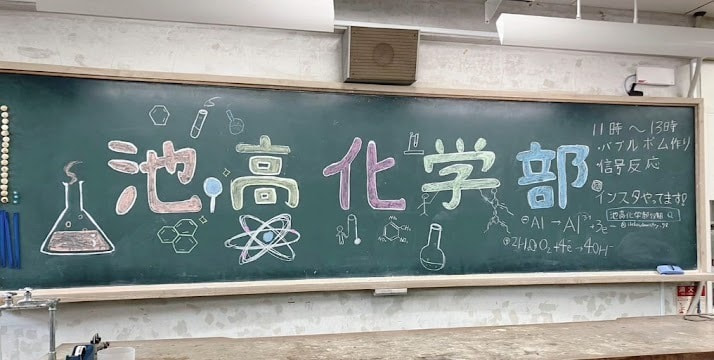 皆さんこんにちは!化学部です。化学部は現在10人で活動していて、活動日は月火木金の週4日です。自由参加で、兼部してる人もいます。